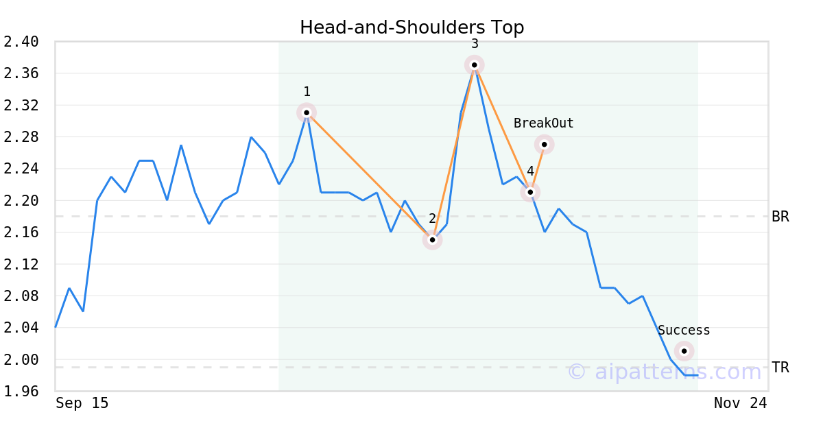On November 03, 2025, A.I.dvisor detected a Head-and-Shoulders Top Pattern (Bearish) for Seer (SEER, $2.27). On November 03, 2025, A.I.dvisor confirmed the Bearish pattern, setting a target price of the stock. On November 17, 2025, the stock hit the target price of $1.99 – resulting in a +1 gain for traders who shorted the stock on the pattern detection date.