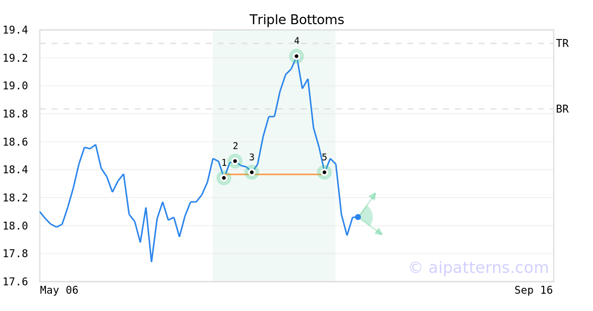 The Triple Bottom pattern appears when there are three distinct low points (1, 3, 5) that represent a consistent support level.
