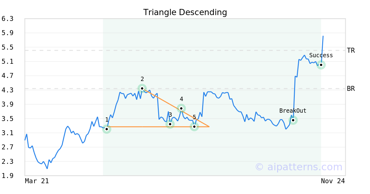 On August 01, 2025, A.I.dvisor detected a Triangle Descending Pattern (Bullish) for Sight Sciences (SGHT, $3.27). On October 16, 2025, A.I.dvisor confirmed the Bullish pattern, setting a target price of $5.41. 21 days later, on November 06, 2025, SGHT reached the target price resulting in a +5 for traders who took a long position in the stock.