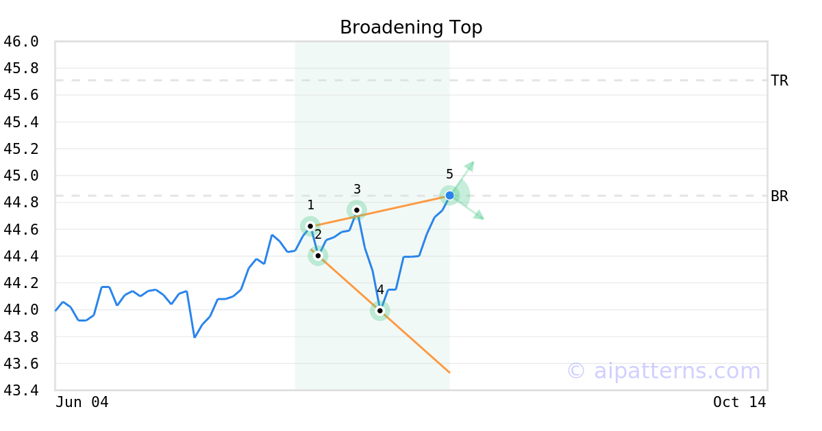 The Broadening Top pattern forms when the price of a security progressively makes higher highs (1, 3) and lower lows (2, 4) following two widening trend lines.