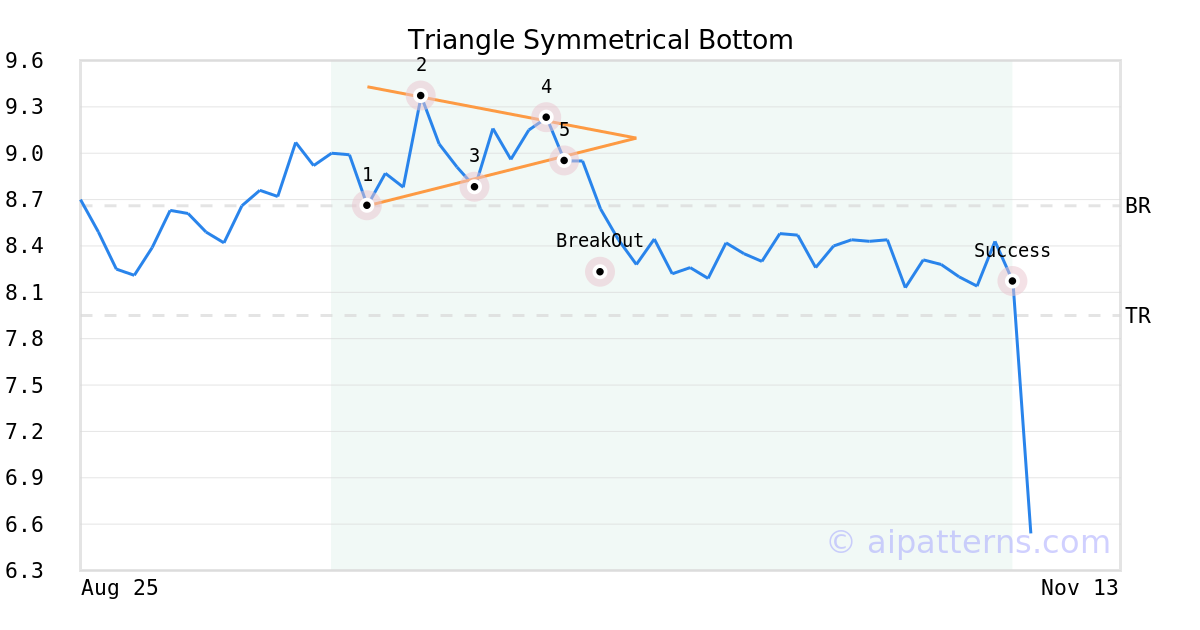 On October 02, 2025, A.I.dvisor detected a Triangle Symmetrical Bottom Pattern (Bearish) for SIGA Technologies (SIGA, $8.95). 4 days later, on October 06, 2025, A.I.dvisor confirmed the Bearish pattern, setting a target price of the stock. On November 06, 2025, the stock hit the target price of $7.95 – resulting in a gain for traders who shorted the stock on the pattern detection date.