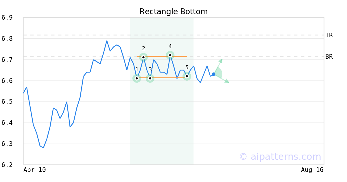 A.I.dvisor detected a bullish Rectangle Bottom pattern for SIGWX stock. This pattern was detected on June 20, 2024 . The odds of reaching the target price are 6. Two horizontal lines (1, 3, 5) and (2, 4) form the Rectangle Bottom Pattern as the security bounces up and down between support and resistance levels. Consider buying a security or call option at the breakout price level. When trading, wait for the confirmation move, which is when the price rises above the breakout level.