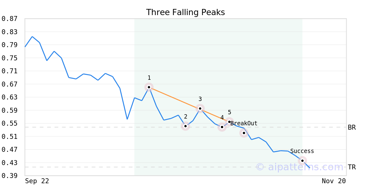 On October 30, 2025, A.I.dvisor detected a Three Falling Peaks Pattern (Bearish) for Silo Pharma (SILO, $0.55). 4 days later, on November 03, 2025, A.I.dvisor confirmed the Bearish pattern, setting a target price of the stock. On November 13, 2025, the stock hit the target price of $0.42 – resulting in a +2 gain for traders who shorted the stock on the pattern detection date.