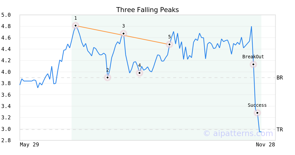 On September 16, 2025, A.I.dvisor detected a Three Falling Peaks Pattern (Bearish) for Southland Holdings (SLND, $4.48). 58 days later, on November 13, 2025, A.I.dvisor confirmed the Bearish pattern, setting a target price of the stock. On November 17, 2025, the stock hit the target price of $2.99 – resulting in a +2 gain for traders who shorted the stock on the pattern detection date.