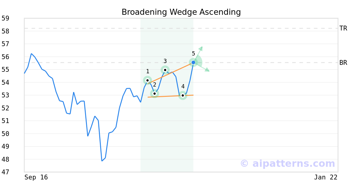 The Broadening Wedge Ascending pattern forms when the price of a security progressively makes higher highs (1, 3) and higher lows (2, 4), following two widening trend lines.
