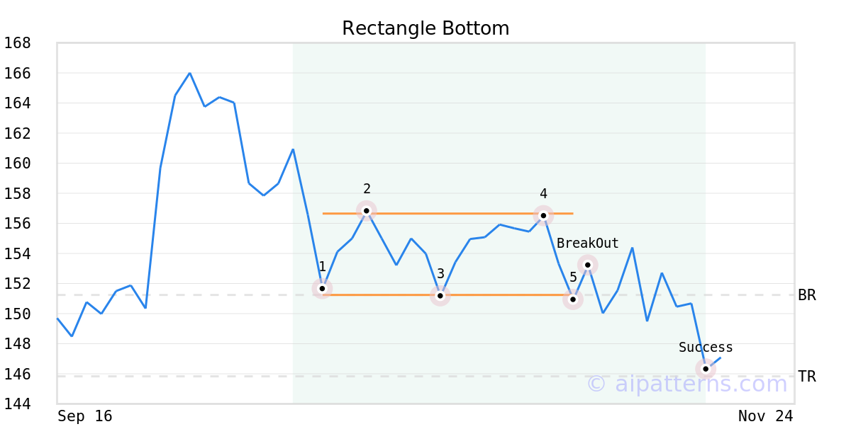 On November 04, 2025, A.I.dvisor detected a Rectangle Bottom Pattern (Bearish) for TD SYNNEX Corp (SNX, $150.92). 1 day later, on November 05, 2025, A.I.dvisor confirmed the Bearish pattern, setting a target price of the stock. On November 17, 2025, the stock hit the target price of $145.83 – resulting in a gain for traders who shorted the stock on the pattern detection date.