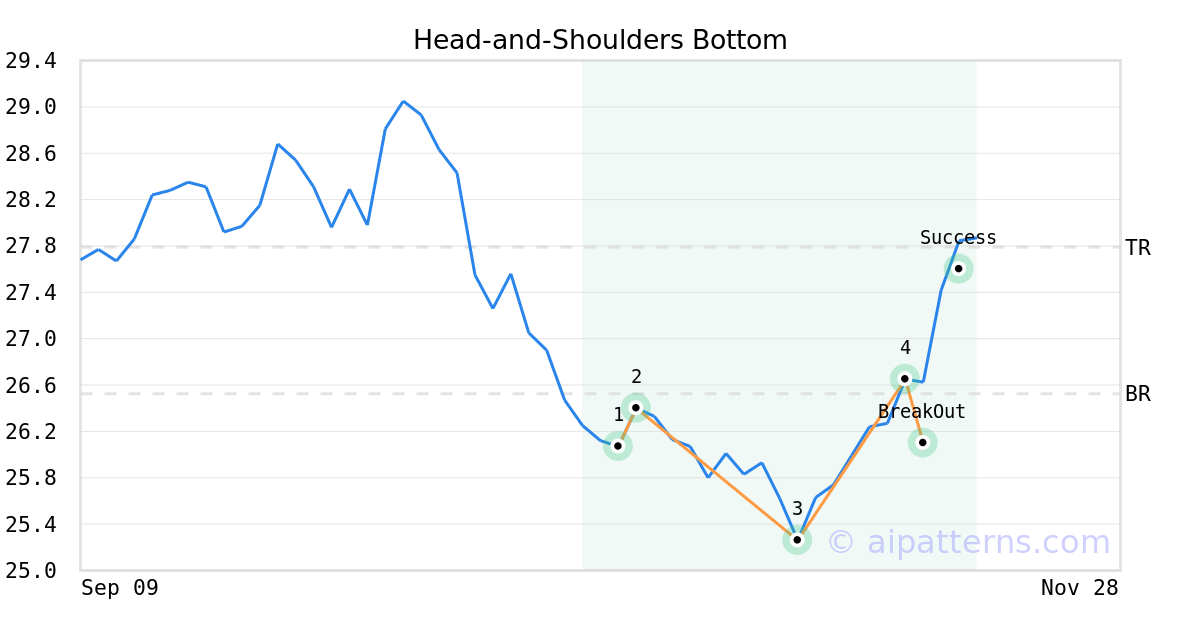 On November 13, 2025, A.I.dvisor detected a Head-and-Shoulders Bottom Pattern (Bullish) for South Bow Corp (SOBO, $26.10). On November 13, 2025, A.I.dvisor confirmed the Bullish pattern, setting a target price of $27.79. 4 days later, on November 17, 2025, SOBO reached the target price resulting in a for traders who took a long position in the stock.