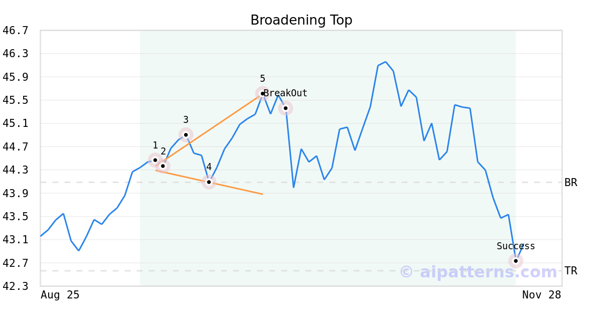 On October 06, 2025, A.I.dvisor detected a Broadening Top Pattern (Bearish) for Simplify US Equity PLUS Bitcoin Stgy ETF (SPBC, $45.61). 3 days later, on October 09, 2025, A.I.dvisor confirmed the Bearish pattern, setting a target price of the stock. On November 20, 2025, the stock hit the target price of $42.56 – resulting in a gain for traders who shorted the stock on the pattern detection date.
