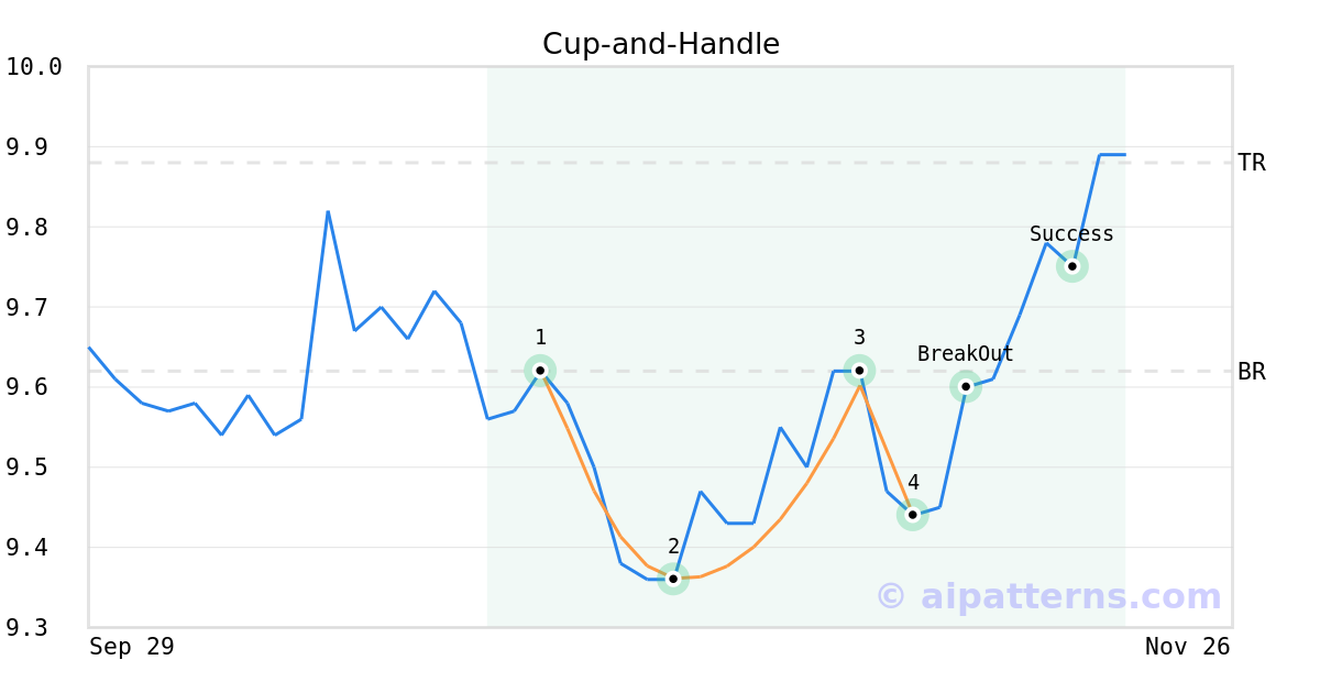 On November 11, 2025, A.I.dvisor detected a Cup-and-Handle Pattern (Bullish) for Direxion Daily S&P 500® Bear 1X ETF (SPDN, $9.44). On November 13, 2025, A.I.dvisor confirmed the Bullish pattern, setting a target price of $9.88. 6 days later, on November 19, 2025, SPDN reached the target price resulting in a for traders who took a long position in the stock.