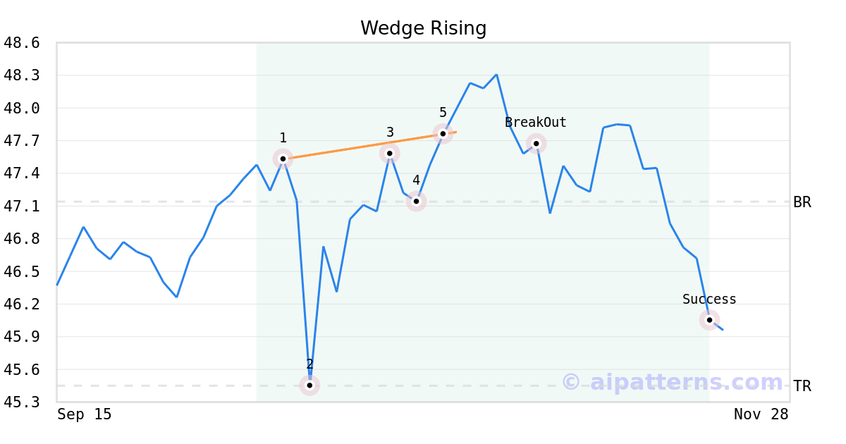 On October 24, 2025, A.I.dvisor detected a Wedge Rising Pattern (Bearish) for SPDR® Portfolio Emerging Markets ETF (SPEM, $47.76). 10 days later, on November 03, 2025, A.I.dvisor confirmed the Bearish pattern, setting a target price of the stock. On November 20, 2025, the stock hit the target price of $45.45 – resulting in a gain for traders who shorted the stock on the pattern detection date.