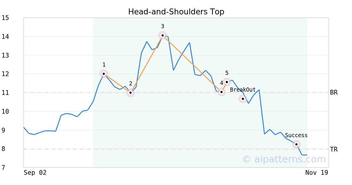 On October 24, 2025, A.I.dvisor detected a Head-and-Shoulders Top Pattern (Bearish) for Spire Global (SPIR, $11.56). 5 days later, on October 29, 2025, A.I.dvisor confirmed the Bearish pattern, setting a target price of the stock. On November 12, 2025, the stock hit the target price of $7.97 – resulting in a +2 gain for traders who shorted the stock on the pattern detection date.
