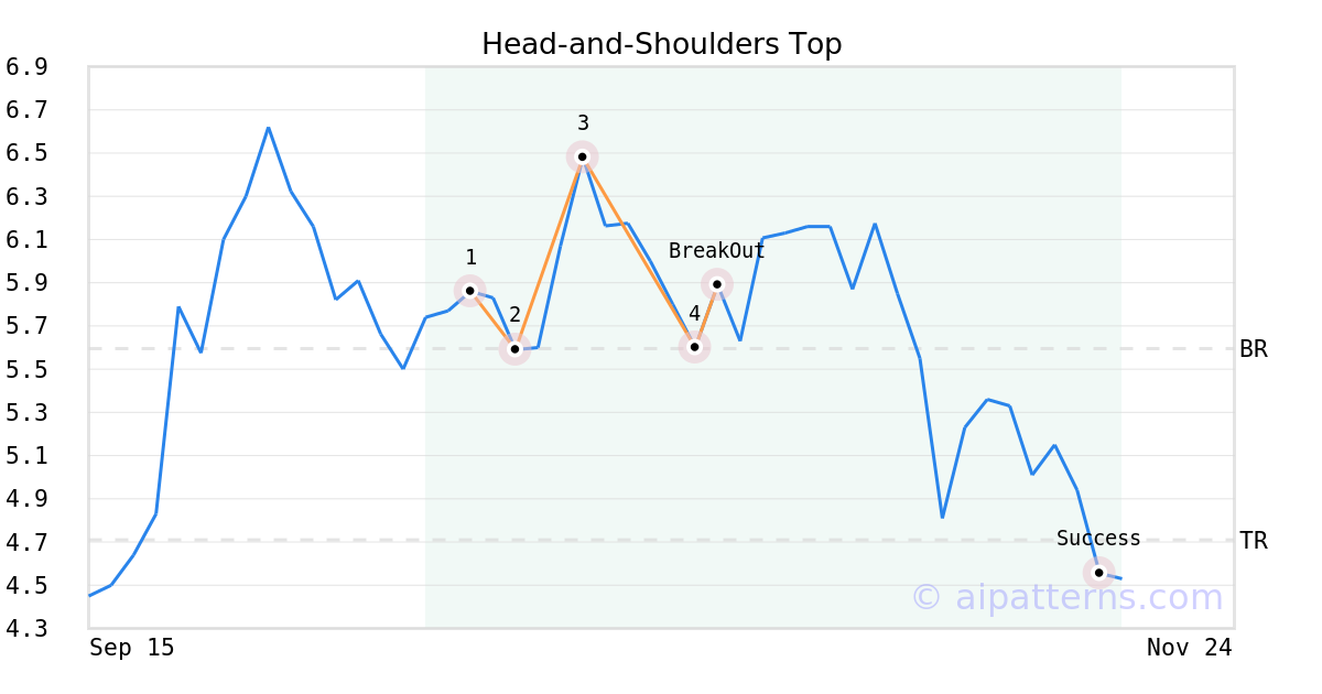 On October 23, 2025, A.I.dvisor detected a Head-and-Shoulders Top Pattern (Bearish) for Simpple Ltd (SPPL, $5.89). On October 23, 2025, A.I.dvisor confirmed the Bearish pattern, setting a target price of the stock. On November 17, 2025, the stock hit the target price of $4.71 – resulting in a +2 gain for traders who shorted the stock on the pattern detection date.