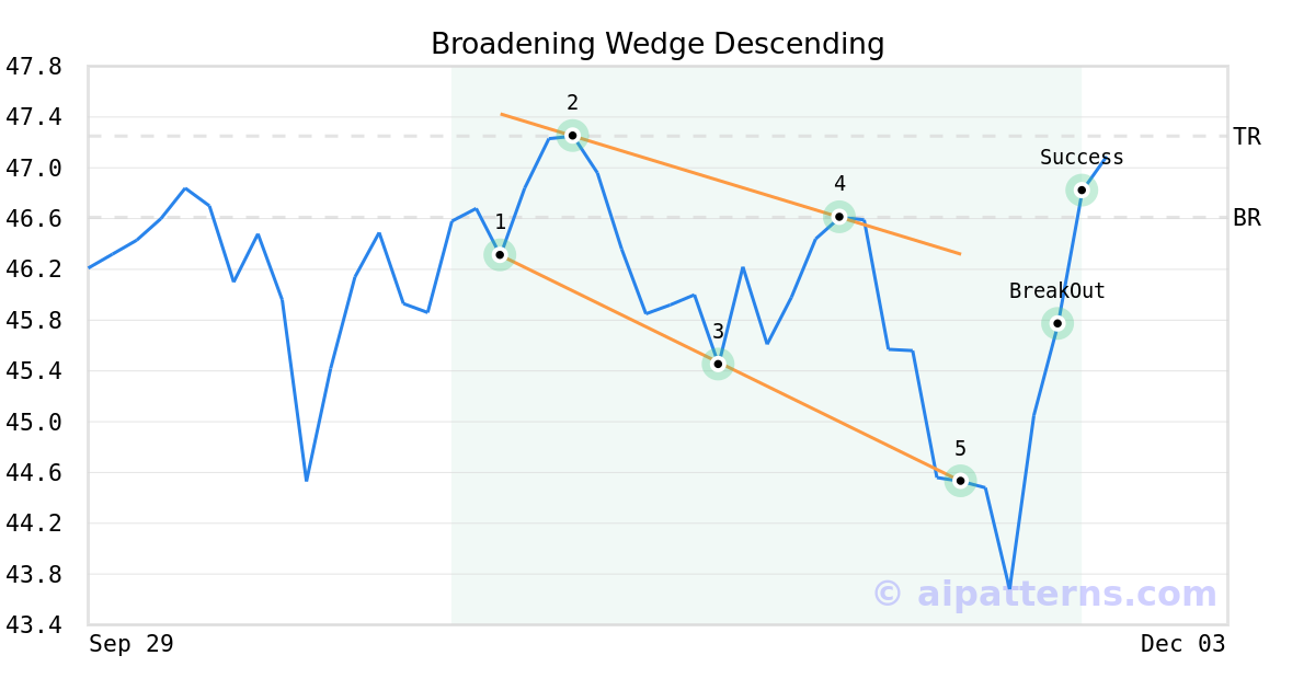 On November 18, 2025, A.I.dvisor detected a Broadening Wedge Descending Pattern (Bullish) for State Street SPDR Port S&P 600 Sm CpETF (SPSM, $44.53). On November 24, 2025, A.I.dvisor confirmed the Bullish pattern, setting a target price of $47.25. 1 day later, on November 25, 2025, SPSM reached the target price resulting in a for traders who took a long position in the stock.