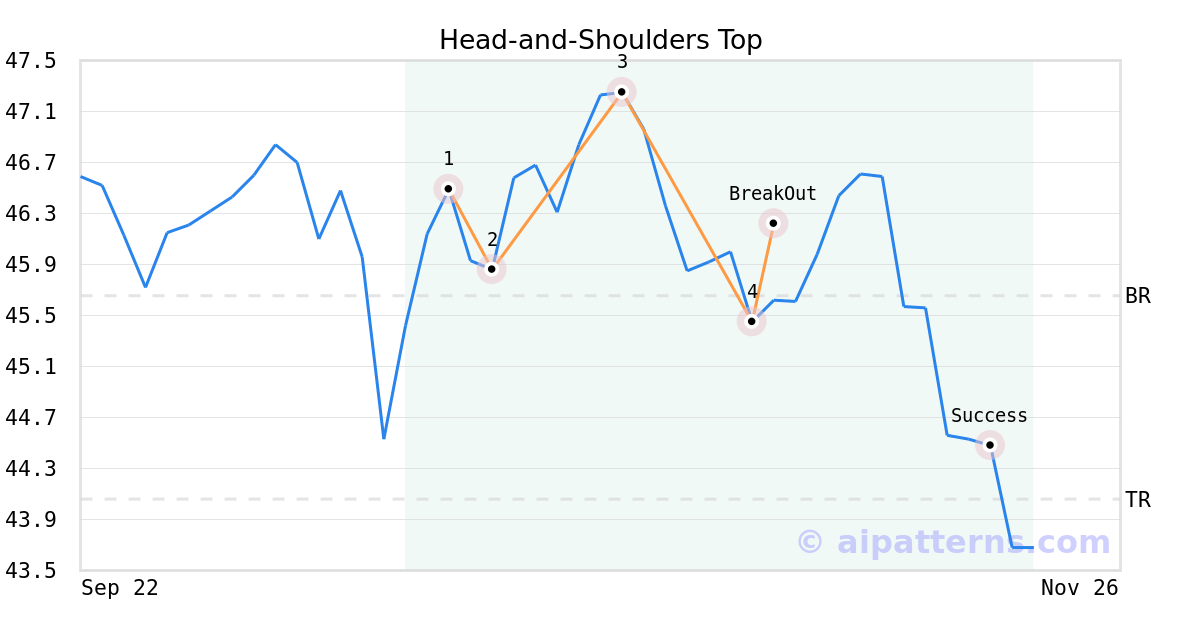 On November 05, 2025, A.I.dvisor detected a Head-and-Shoulders Top Pattern (Bearish) for State Street SPDR Port S&P 600 Sm CpETF (SPSM, $46.22). On November 05, 2025, A.I.dvisor confirmed the Bearish pattern, setting a target price of the stock. On November 19, 2025, the stock hit the target price of $44.06 – resulting in a gain for traders who shorted the stock on the pattern detection date.