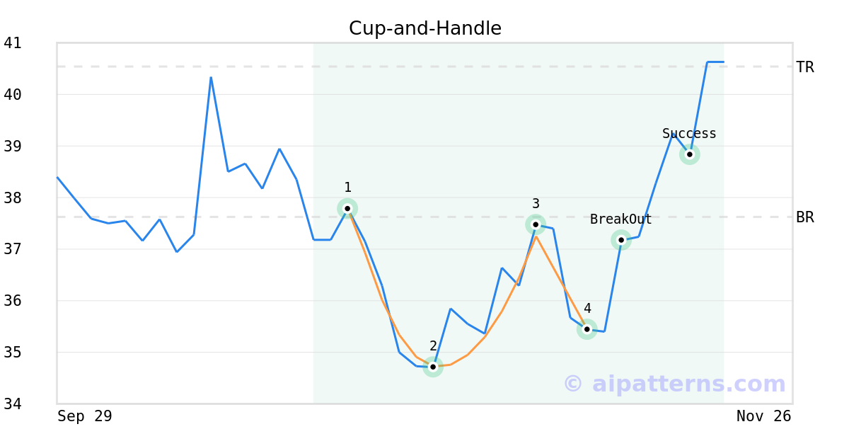 On November 11, 2025, A.I.dvisor detected a Cup-and-Handle Pattern (Bullish) for Direxion Daily S&P 500® Bear 3X ETF (SPXS, $35.44). On November 13, 2025, A.I.dvisor confirmed the Bullish pattern, setting a target price of $40.54. 6 days later, on November 19, 2025, SPXS reached the target price resulting in a for traders who took a long position in the stock.