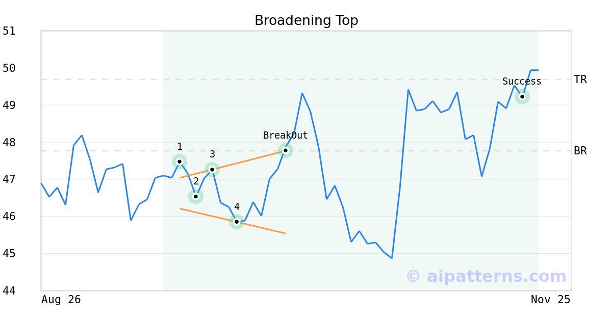 On October 08, 2025, A.I.dvisor detected a Broadening Top Pattern (Bullish) for ProShares UltraShort Real Estate (SRS, $47.77). On October 08, 2025, A.I.dvisor confirmed the Bullish pattern, setting a target price of $49.69. 41 days later, on November 18, 2025, SRS reached the target price resulting in a for traders who took a long position in the stock.