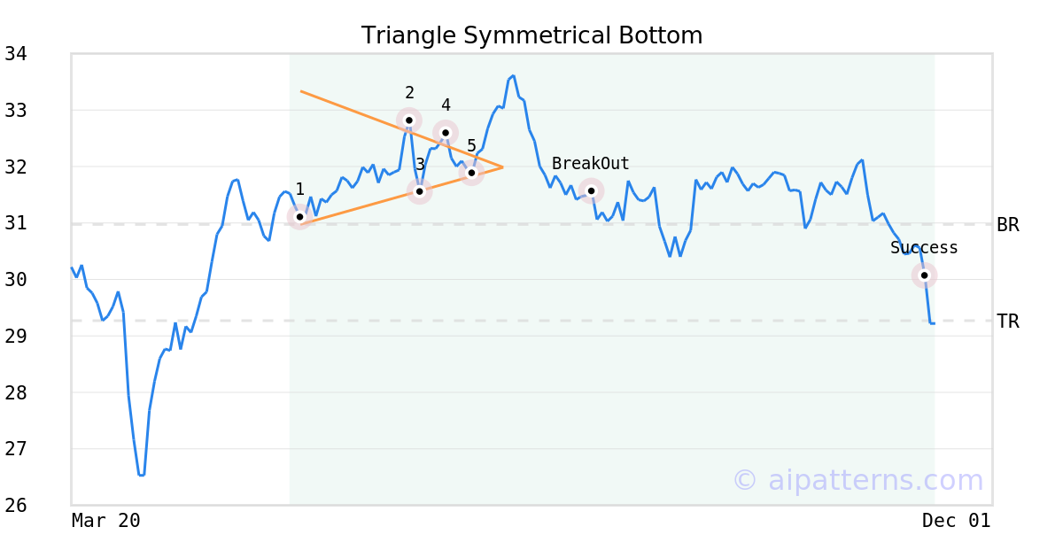 On July 11, 2025, A.I.dvisor detected a Triangle Symmetrical Bottom Pattern (Bearish) for Pacer Benchmark Data&Infras RE SCTR ETF (SRVR, $31.75). 33 days later, on August 13, 2025, A.I.dvisor confirmed the Bearish pattern, setting a target price of the stock. On November 12, 2025, the stock hit the target price of $29.27 – resulting in a gain for traders who shorted the stock on the pattern detection date.