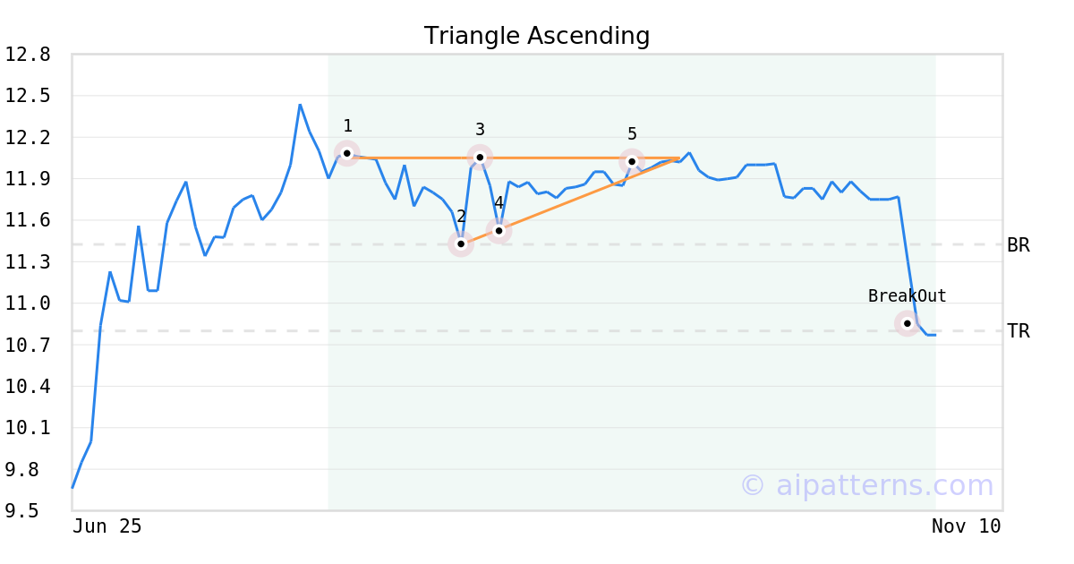 On September 18, 2025, A.I.dvisor detected a Triangle Ascending Pattern (Bearish) for Summit State Bank (SSBI, $12.02). 41 days later, on October 29, 2025, A.I.dvisor confirmed the Bearish pattern, setting a target price of the stock. On October 29, 2025, the stock hit the target price of $10.80 – resulting in a gain for traders who shorted the stock on the pattern detection date.