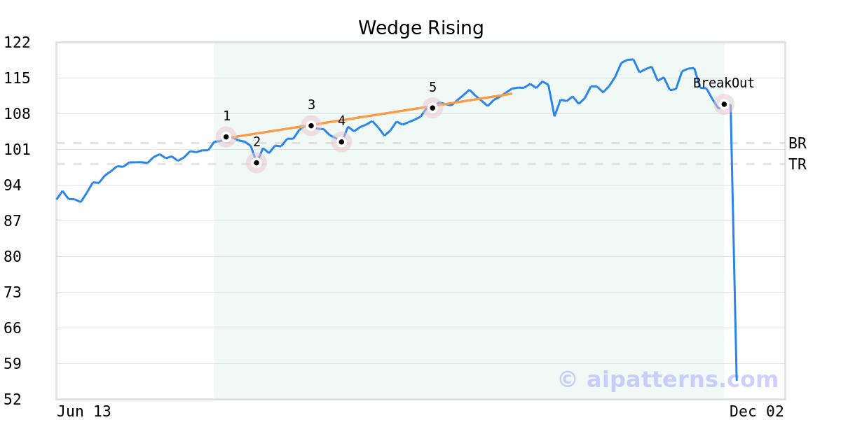 On September 12, 2025, A.I.dvisor detected a Wedge Rising Pattern (Bearish) for ProShares Ultra S&P500 (SSO, $108.89). 68 days later, on November 19, 2025, A.I.dvisor confirmed the Bearish pattern, setting a target price of the stock. On November 19, 2025, the stock hit the target price of $98.14 – resulting in a gain for traders who shorted the stock on the pattern detection date.