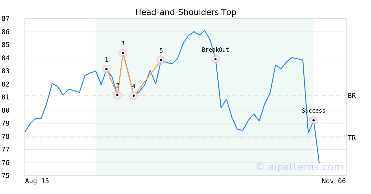 On September 22, 2025, A.I.dvisor detected a Head-and-Shoulders Top Pattern (Bearish) for Strategic Education (STRA, $83.82). 14 days later, on October 06, 2025, A.I.dvisor confirmed the Bearish pattern, setting a target price of the stock. On October 30, 2025, the stock hit the target price of $77.89 – resulting in a gain for traders who shorted the stock on the pattern detection date.