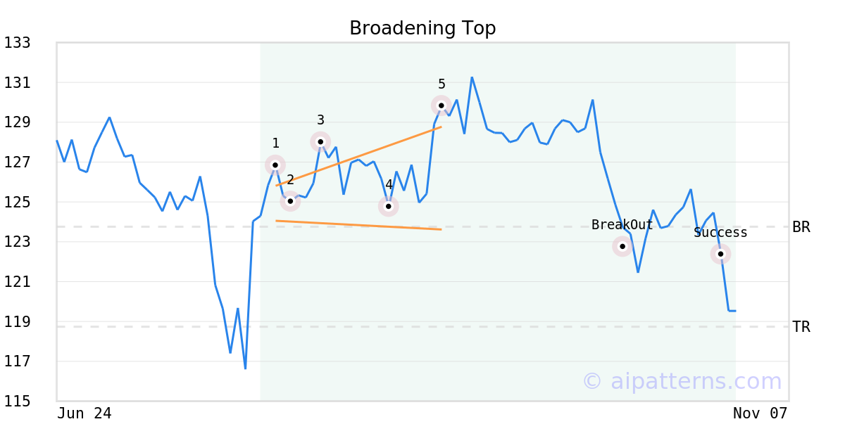 On September 05, 2025, A.I.dvisor detected a Broadening Top Pattern (Bearish) for Sun Communities (SUI, $128.77). 34 days later, on October 09, 2025, A.I.dvisor confirmed the Bearish pattern, setting a target price of the stock. On October 28, 2025, the stock hit the target price of $118.74 – resulting in a gain for traders who shorted the stock on the pattern detection date.