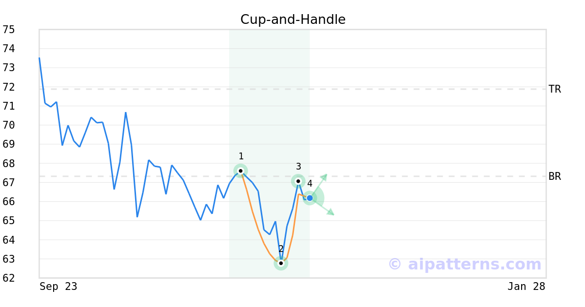 The Cup-and-Handle (sometimes called Cup-and-Holder) pattern is formed when the price of a security initially declines and then rises to form a “U”-like rounded shape (1, 2, 3, also known as the Cup). Once it forms the right lip, it is characterized by short, relatively straight price decline (from 3 to 4) forming the handle.