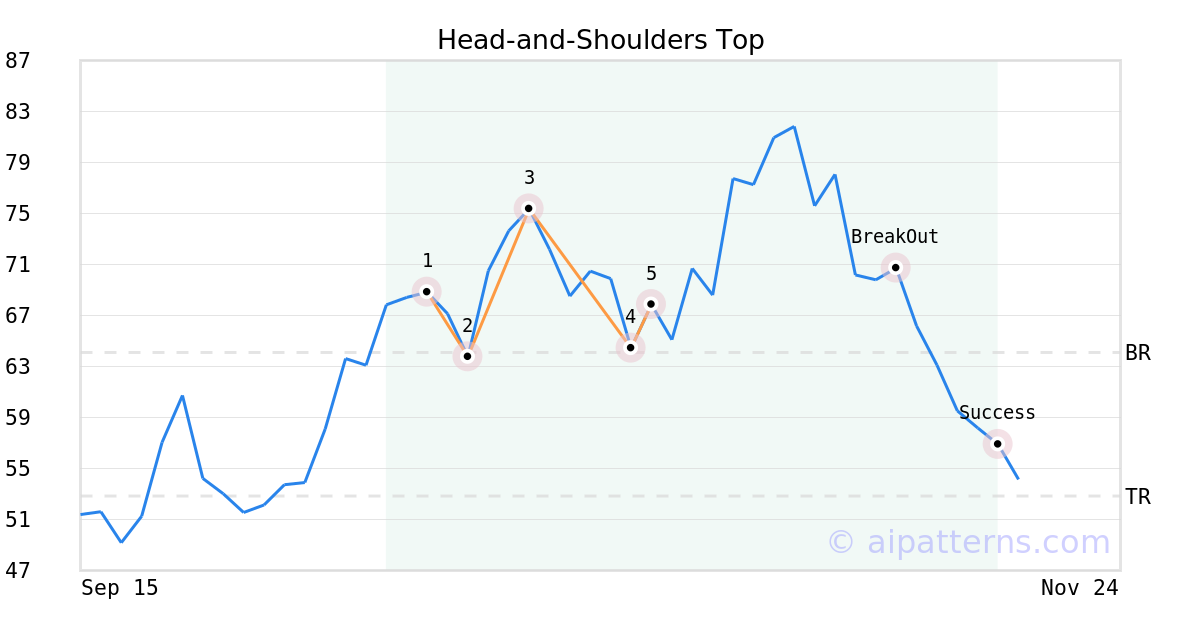 On October 23, 2025, A.I.dvisor detected a Head-and-Shoulders Top Pattern (Bearish) for Symbotic (SYM, $67.86). 18 days later, on November 10, 2025, A.I.dvisor confirmed the Bearish pattern, setting a target price of the stock. On November 17, 2025, the stock hit the target price of $52.84 – resulting in a +1 gain for traders who shorted the stock on the pattern detection date.