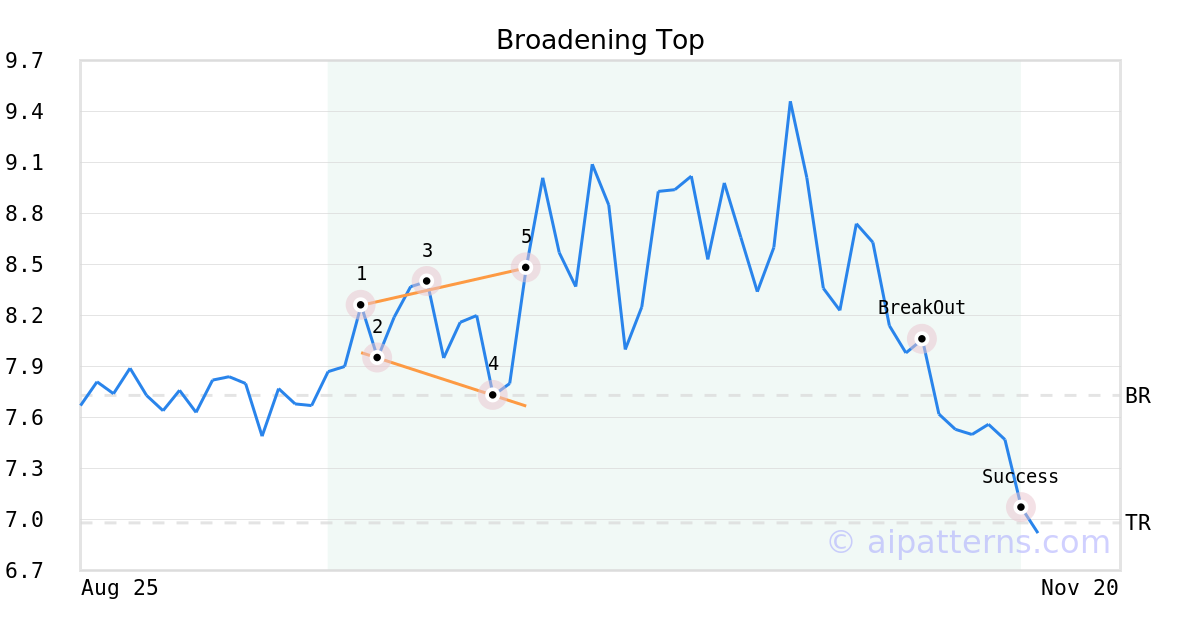 On October 02, 2025, A.I.dvisor detected a Broadening Top Pattern (Bearish) for Teladoc Health (TDOC, $8.48). 34 days later, on November 05, 2025, A.I.dvisor confirmed the Bearish pattern, setting a target price of the stock. On November 13, 2025, the stock hit the target price of $6.98 – resulting in a +1 gain for traders who shorted the stock on the pattern detection date.
