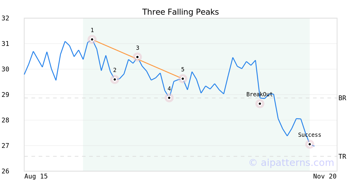 On October 06, 2025, A.I.dvisor detected a Three Falling Peaks Pattern (Bearish) for Tenable Holdings (TENB, $29.62). 23 days later, on October 29, 2025, A.I.dvisor confirmed the Bearish pattern, setting a target price of the stock. On November 13, 2025, the stock hit the target price of $26.58 – resulting in a gain for traders who shorted the stock on the pattern detection date.