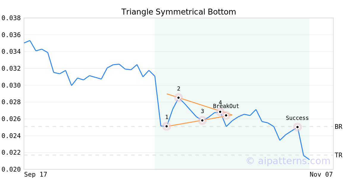 On October 21, 2025, A.I.dvisor detected a Triangle Symmetrical Bottom Pattern (Bearish) for Theta Fuel cryptocurrency (TFUEL.X, $0.026478). On October 21, 2025, A.I.dvisor confirmed the Bearish pattern, setting a target price of the stock. On November 02, 2025, the stock hit the target price of $0.021700 – resulting in a gain for traders who shorted the stock on the pattern detection date.