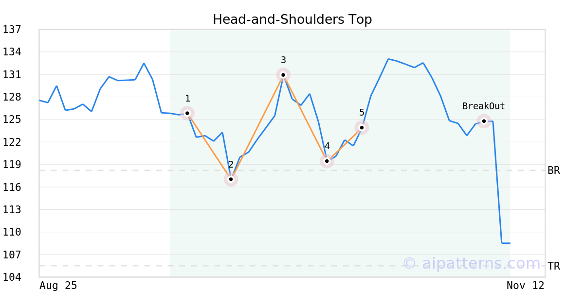 On October 16, 2025, A.I.dvisor detected a Head-and-Shoulders Top Pattern (Bearish) for Teleflex (TFX, $123.88). 20 days later, on November 05, 2025, A.I.dvisor confirmed the Bearish pattern, setting a target price of the stock. On November 05, 2025, the stock hit the target price of $105.52 – resulting in a gain for traders who shorted the stock on the pattern detection date.