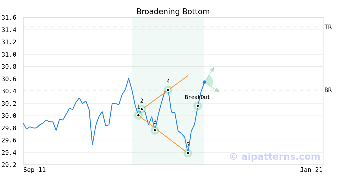 The Broadening Bottom pattern is formed when the price of a security progressively makes higher highs (2, 4) and lower lows (1, 3, 5) following two widening trend lines.