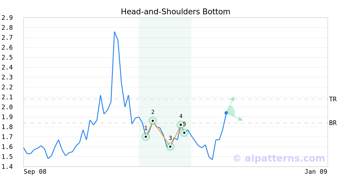 The Head-and-Shoulders Bottom pattern is formed when the price of a security creates a center trough (the inverted head, labeled 3) and the left and right inverted shoulders (1, 5). After reaching the lowest low (the Head, 3) the next low is shallower and the trend reverses course to the upside.