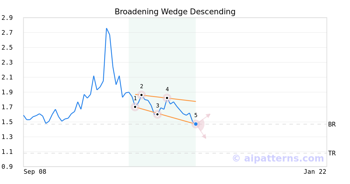 The Broadening Wedge Descending pattern forms when a security price makes lower lows (1, 3, 5) and lower highs (2, 4), forming two downward sloping lines that expand over time.