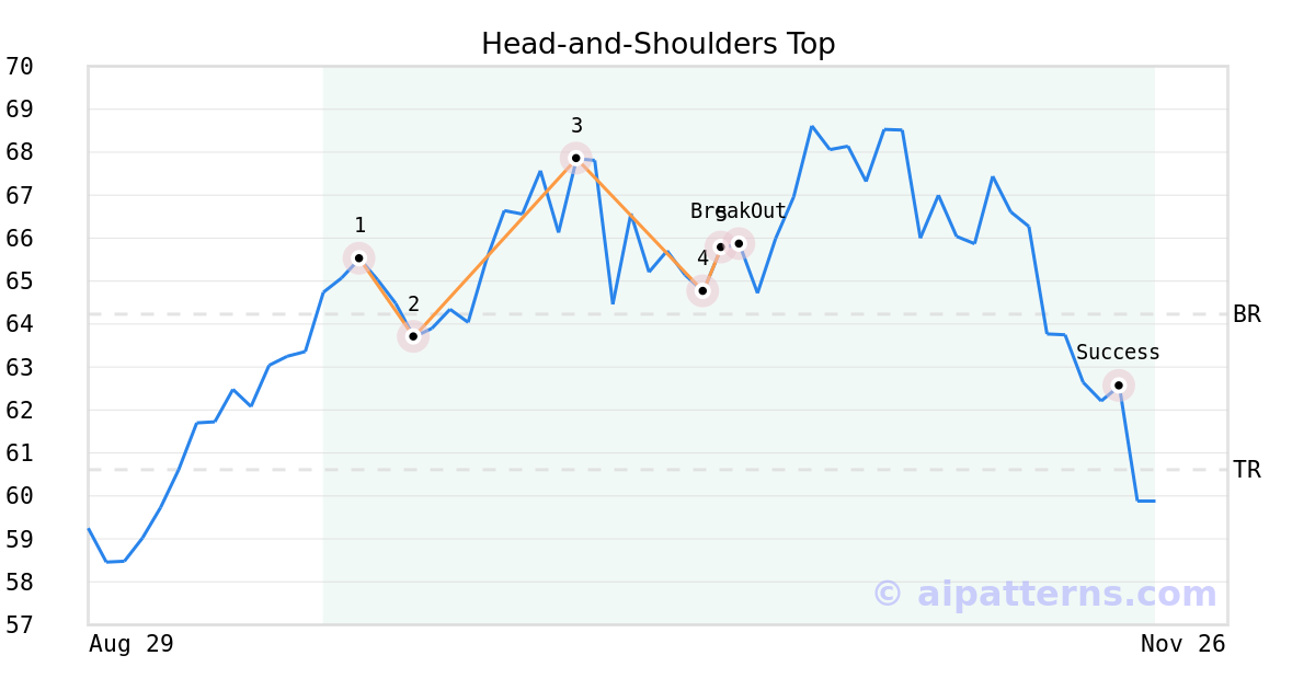 On October 20, 2025, A.I.dvisor detected a Head-and-Shoulders Top Pattern (Bearish) for Robo Global® Artificial Intelligence ETF (THNQ, $65.78). 1 day later, on October 21, 2025, A.I.dvisor confirmed the Bearish pattern, setting a target price of the stock. On November 19, 2025, the stock hit the target price of $60.61 – resulting in a gain for traders who shorted the stock on the pattern detection date.