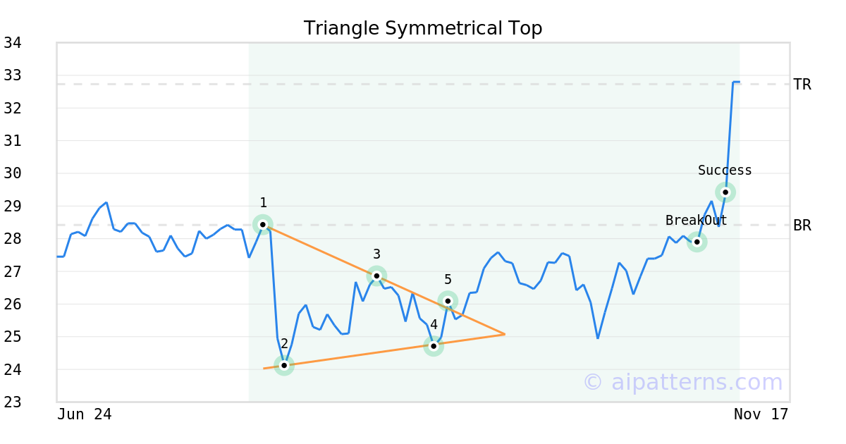 On September 11, 2025, A.I.dvisor detected a Triangle Symmetrical Top Pattern (Bullish) for Thermon Group Holdings (THR, $26.08). On October 30, 2025, A.I.dvisor confirmed the Bullish pattern, setting a target price of $32.73. 6 days later, on November 05, 2025, THR reached the target price resulting in a +1 for traders who took a long position in the stock.