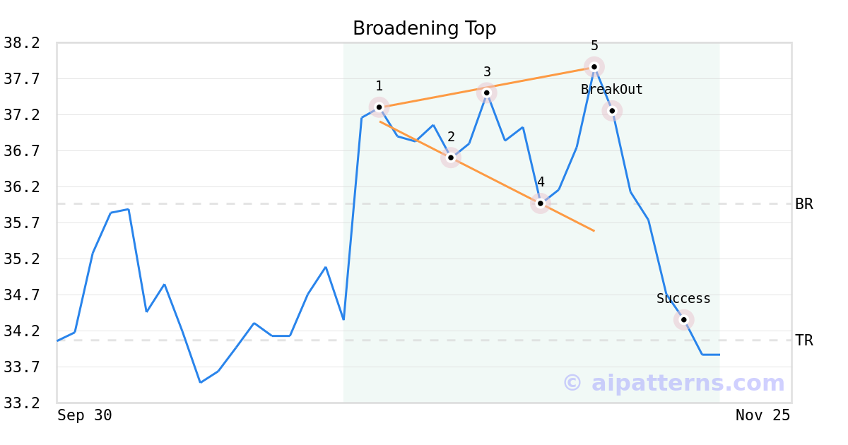 On November 11, 2025, A.I.dvisor detected a Broadening Top Pattern (Bearish) for Gentherm (THRM, $37.86). 1 day later, on November 12, 2025, A.I.dvisor confirmed the Bearish pattern, setting a target price of the stock. On November 18, 2025, the stock hit the target price of $34.07 – resulting in a gain for traders who shorted the stock on the pattern detection date.