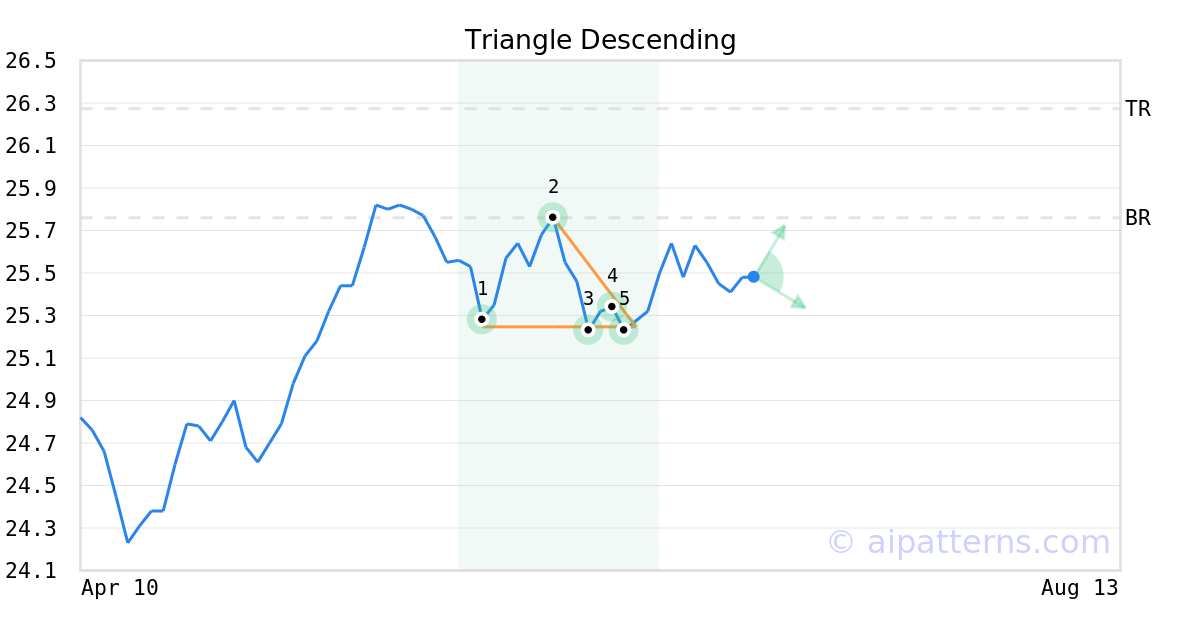 The Descending Triangle pattern is formed when the price of a security establishes a support level (1, 3, 5) and bounces off that level to a declining resistance level, creating a down-sloping top line (2, 4).