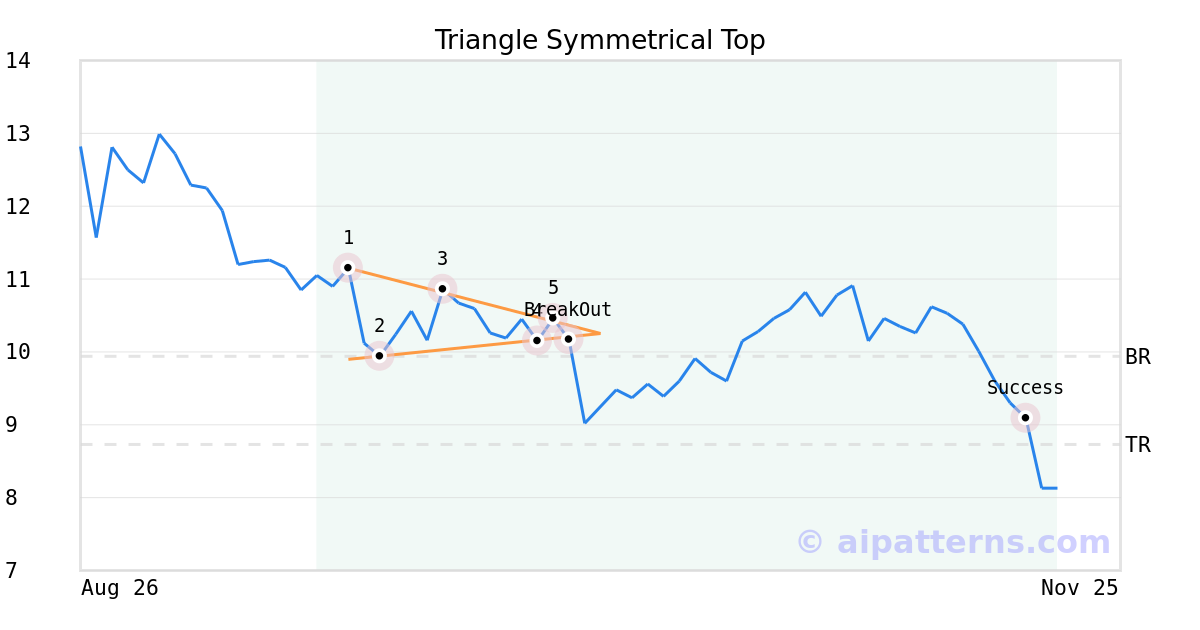 On October 08, 2025, A.I.dvisor detected a Triangle Symmetrical Top Pattern (Bearish) for UP Fintech Holding Ltd (TIGR, $10.46). 1 day later, on October 09, 2025, A.I.dvisor confirmed the Bearish pattern, setting a target price of the stock. On November 18, 2025, the stock hit the target price of $8.73 – resulting in a +1 gain for traders who shorted the stock on the pattern detection date.