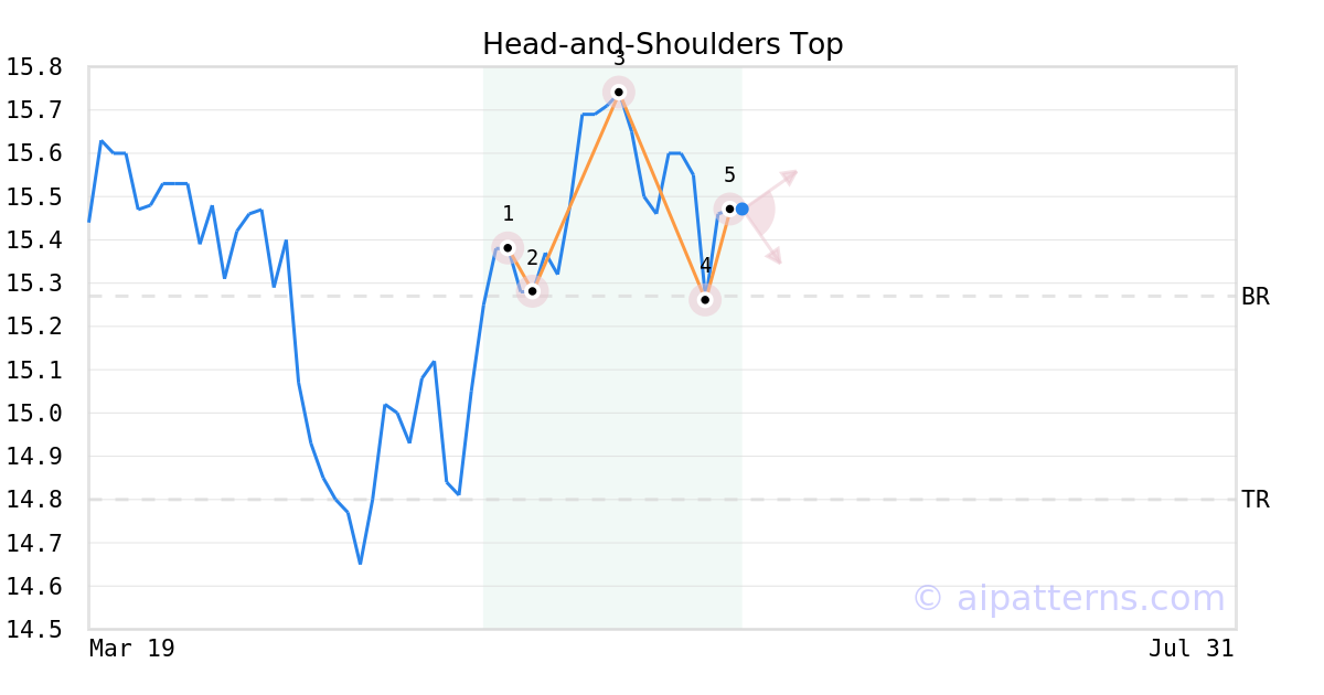 The pattern forms with a center peak (the Head, labeled 3) and left and right Shoulders (1, 5). Eventually the security stops testing highs and reverses trend into a decline.