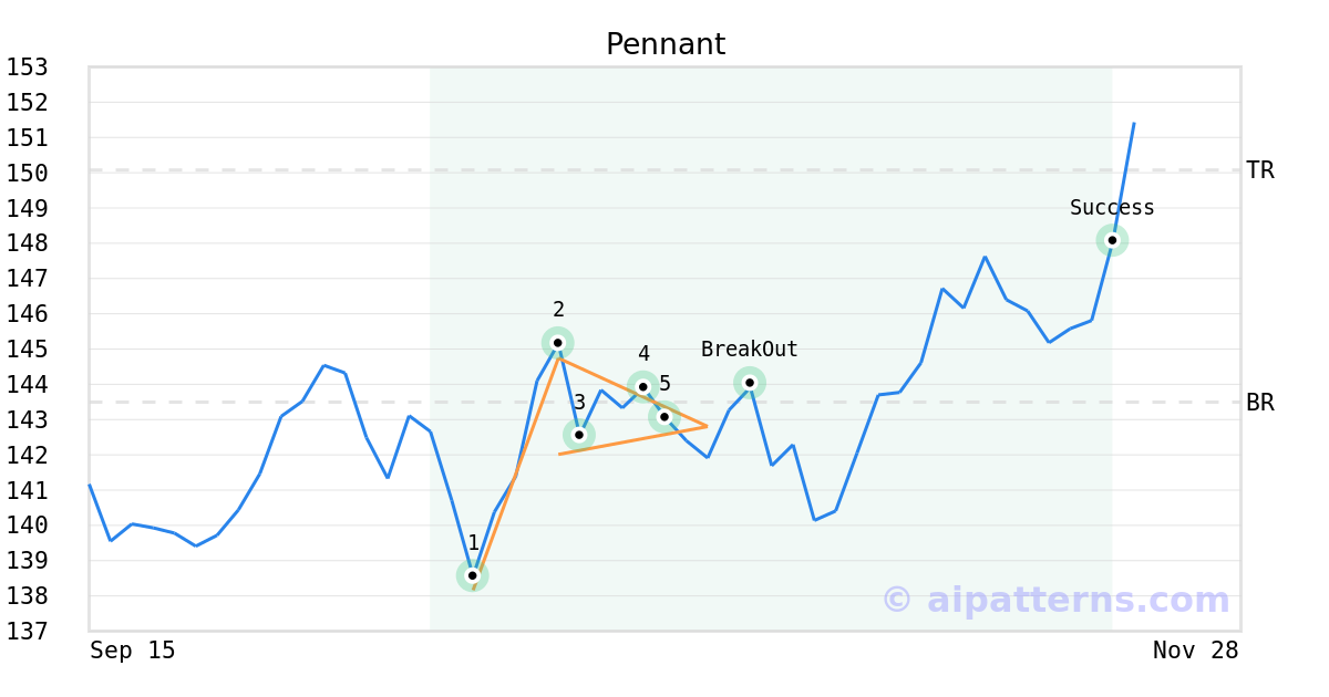 On October 22, 2025, A.I.dvisor detected a Pennant Pattern (Bullish) for TJX Companies (TJX, $142.65). On October 28, 2025, A.I.dvisor confirmed the Bullish pattern, setting a target price of $150.08. 23 days later, on November 20, 2025, TJX reached the target price resulting in a for traders who took a long position in the stock.