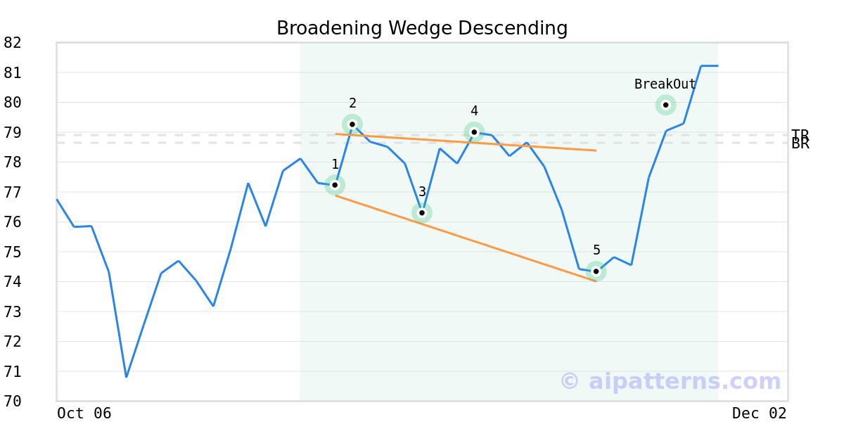 On November 18, 2025, A.I.dvisor detected a Broadening Wedge Descending Pattern (Bullish) for Timken Company (The) (TKR, $74.00). On November 24, 2025, A.I.dvisor confirmed the Bullish pattern, setting a target price of $78.90. On November 24, 2025, TKR reached the target price resulting in a for traders who took a long position in the stock.