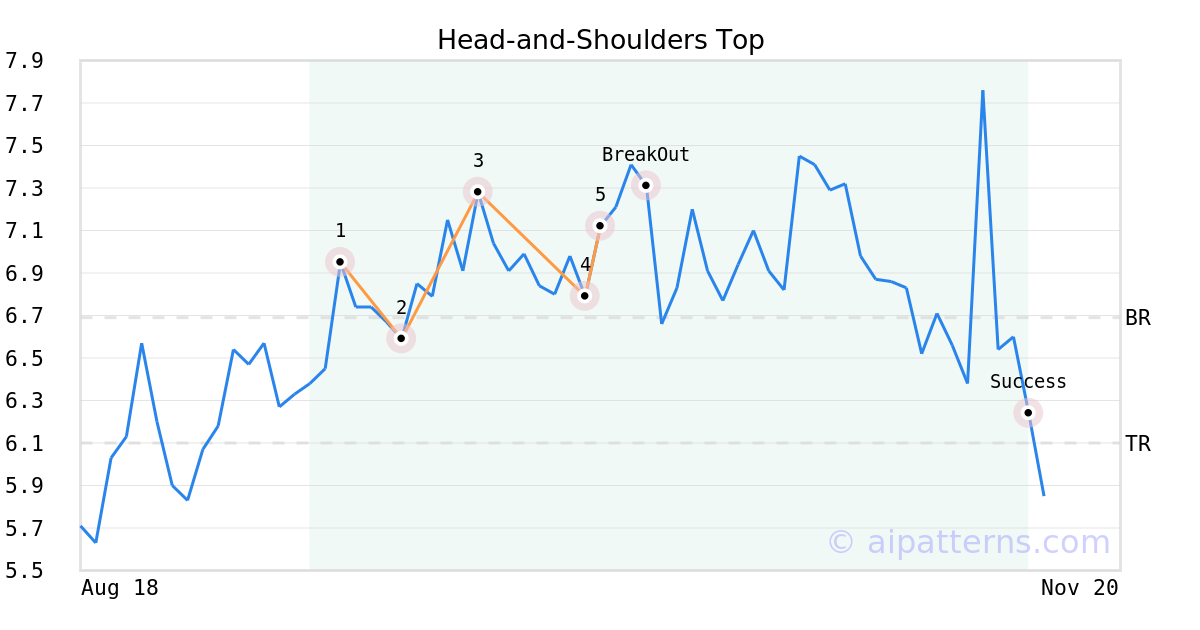 On October 06, 2025, A.I.dvisor detected a Head-and-Shoulders Top Pattern (Bearish) for Telos Corp (TLS, $7.12). 3 days later, on October 09, 2025, A.I.dvisor confirmed the Bearish pattern, setting a target price of the stock. On November 13, 2025, the stock hit the target price of $6.10 – resulting in a +1 gain for traders who shorted the stock on the pattern detection date.
