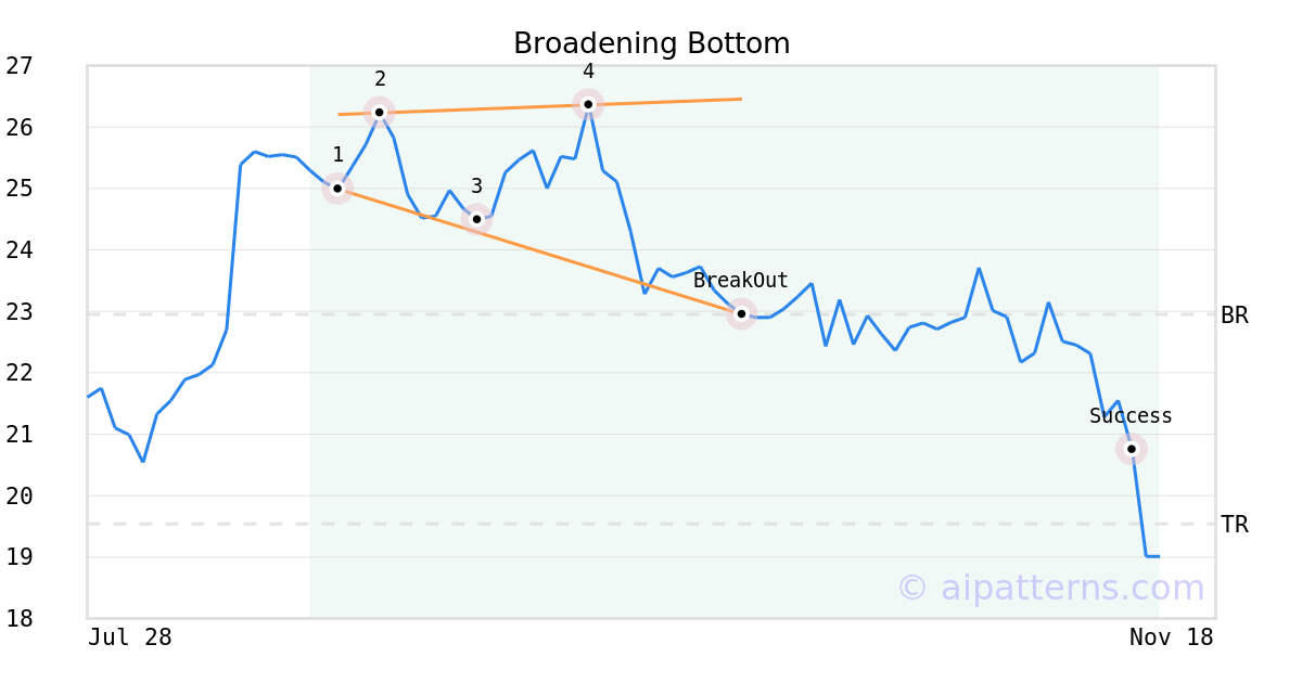 On October 02, 2025, A.I.dvisor detected a Broadening Bottom Pattern (Bearish) for Tencent Music Entertainment Group (TME, $22.95). On October 02, 2025, A.I.dvisor confirmed the Bearish pattern, setting a target price of the stock. On November 11, 2025, the stock hit the target price of $19.54 – resulting in a gain for traders who shorted the stock on the pattern detection date.