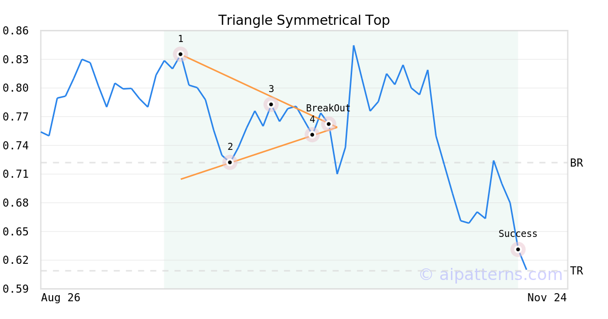 On October 15, 2025, A.I.dvisor detected a Triangle Symmetrical Top Pattern (Bearish) for Kartoon Studios (TOON, $0.76). On October 15, 2025, A.I.dvisor confirmed the Bearish pattern, setting a target price of the stock. On November 17, 2025, the stock hit the target price of $0.61 – resulting in a +1 gain for traders who shorted the stock on the pattern detection date.