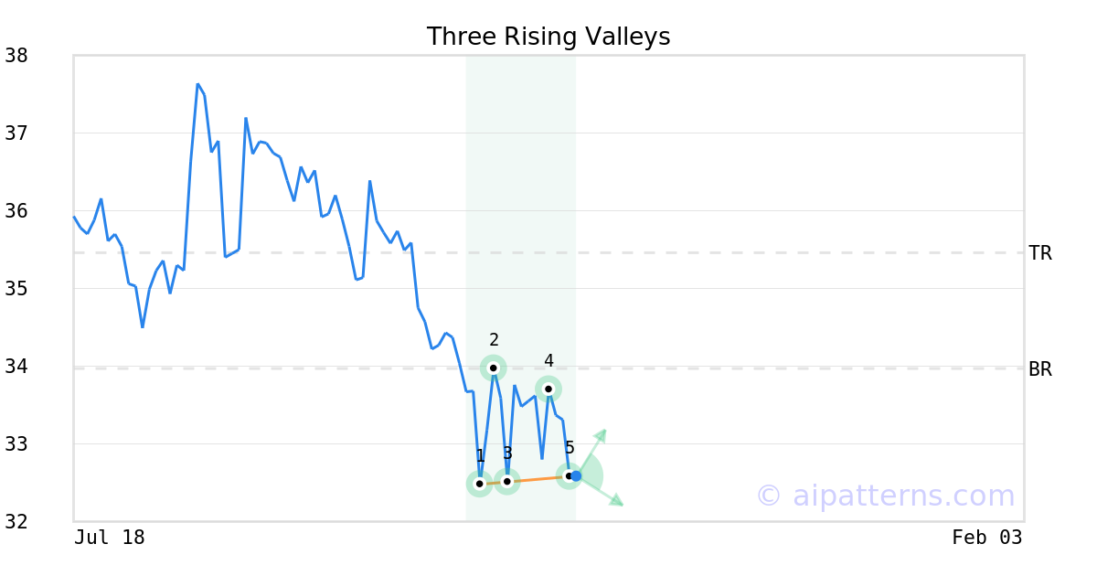 The Three Rising Valleys pattern forms when three minor Lows (1, 3, 5) are arranged along an upward sloping trend line.