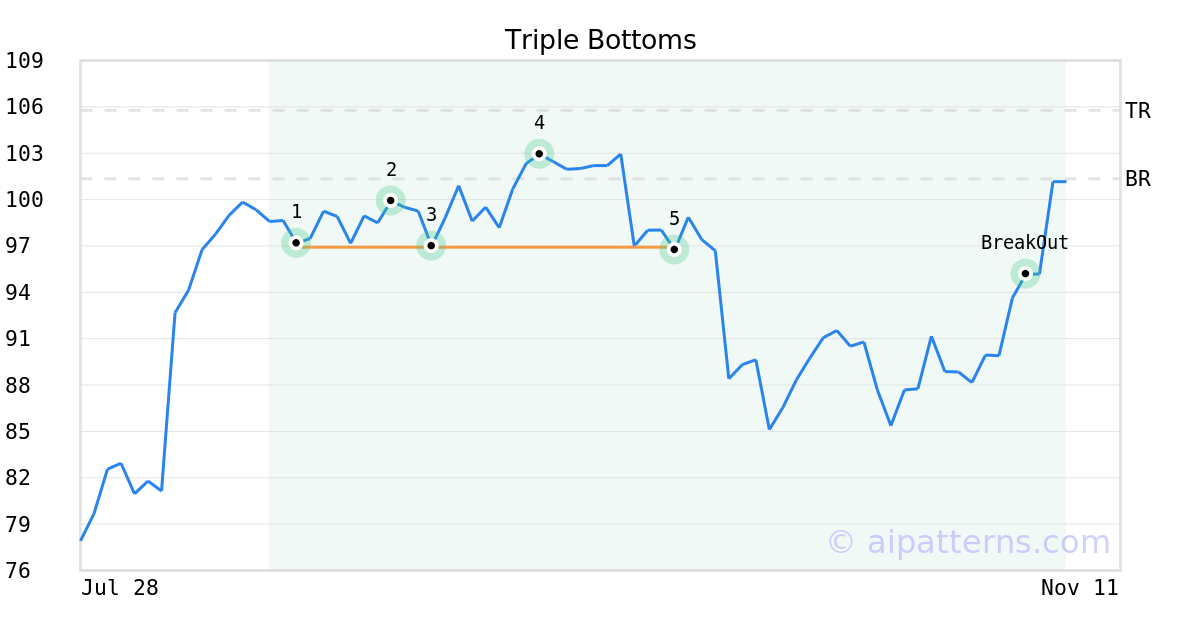 On September 29, 2025, A.I.dvisor detected a Triple Bottoms Pattern (Bullish) for Turning Point Brands (TPB, $96.74). On November 04, 2025, A.I.dvisor confirmed the Bullish pattern, setting a target price of $105.77. On November 04, 2025, TPB reached the target price resulting in a for traders who took a long position in the stock.