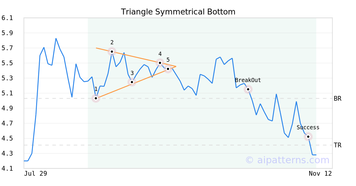 On September 18, 2025, A.I.dvisor detected a Triangle Symmetrical Bottom Pattern (Bearish) for TechPrecision Corp (TPCS, $5.42). 27 days later, on October 15, 2025, A.I.dvisor confirmed the Bearish pattern, setting a target price of the stock. On November 05, 2025, the stock hit the target price of $4.41 – resulting in a +1 gain for traders who shorted the stock on the pattern detection date.