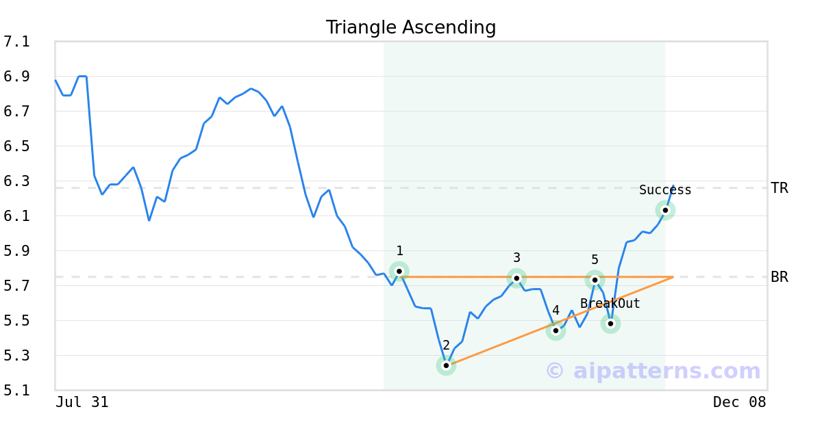 On November 06, 2025, A.I.dvisor detected a Triangle Ascending Pattern (Bullish) for TRIPLEPOINT VENTURE GROWTH BDC Corp (TPVG, $5.73). On November 10, 2025, A.I.dvisor confirmed the Bullish pattern, setting a target price of $6.26. 9 days later, on November 19, 2025, TPVG reached the target price resulting in a for traders who took a long position in the stock.