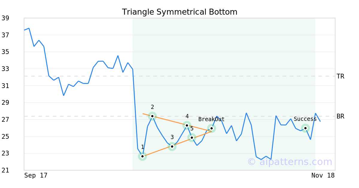 On October 21, 2025, A.I.dvisor detected a Triangle Symmetrical Bottom Pattern (Bullish) for Tellor cryptocurrency (TRB.X, $24.827480). On October 25, 2025, A.I.dvisor confirmed the Bullish pattern, setting a target price of $32.130000. 19 days later, on November 13, 2025, TRB.X reached the target price resulting in a for traders who took a long position in the stock.